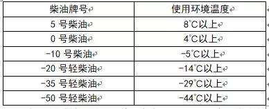 為了使發(fā)動機擁有更高的可靠性和更好的經(jīng)濟型,柴油應選用符合19147-2018國六標準的正規(guī)柴油,并隨著地區(qū)環(huán)境氣溫的不同而選用不同牌號的清潔柴油。根據(jù)使用環(huán)境氣溫,按下表選用不同牌號的清潔柴油: